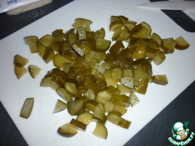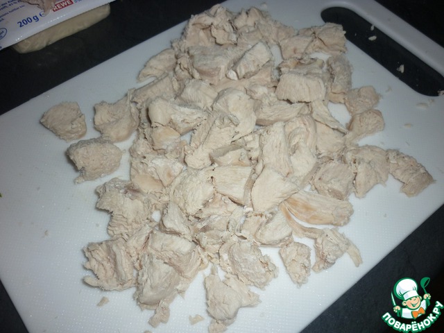 Сварить курочку, нарезать на небольшие кусочки и дать остыть