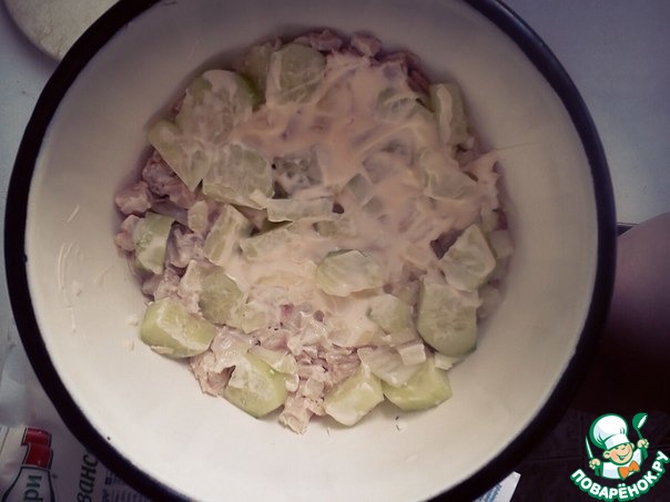 Третий слой - луковица и огурец. Я порезал крупно, как говорится " на любителя"