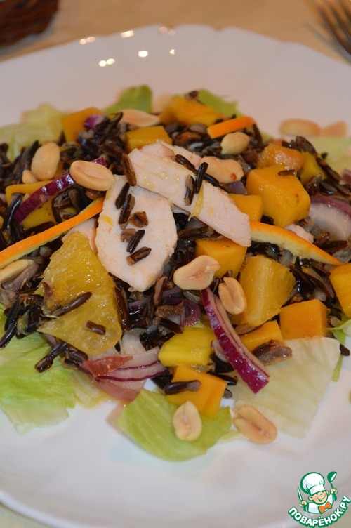 | Очень вкусный и сочный экзотический салат. Дикий рис прекрасно гармонирует со спелым манго и апельсином. Такой салат прекрасно подходит для легкого обеда или ужина. |