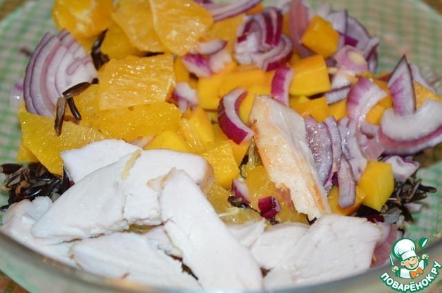 В большую миску сложить остывший рис, куриное филе, апельсины, манго и лук.
