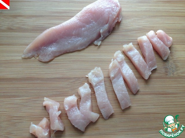 Куриное филе разрезаем на 2 тонких пласта, затем на вот такие сегменты.