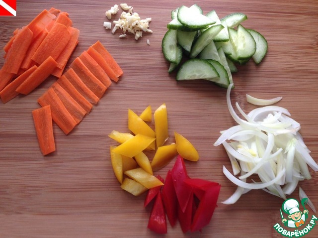 Режем овощи - морковь, болгарский перец, огурец, лук и мелко рубим чеснок.