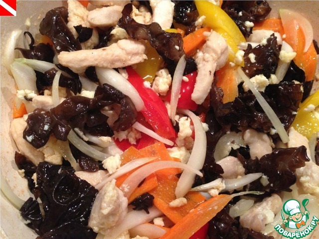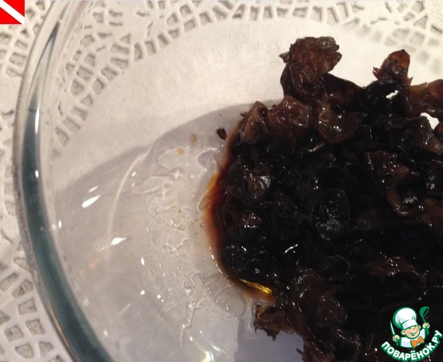 Для приготовления этого салата нам заранее (минут за 10-15) нужно будет залить кипятком черные китайские грибы. Они обычно продаются прессованные, вес указан в сухом виде.