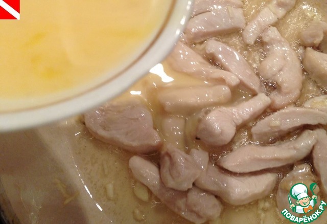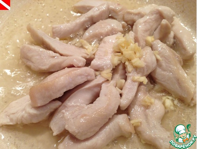 На второй половине растительного масла обжариваем куриное филе около 5-7 минут. Перчим по вкусу.