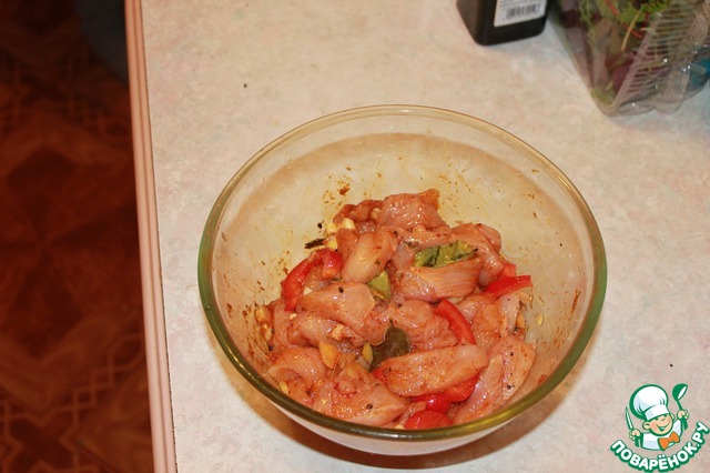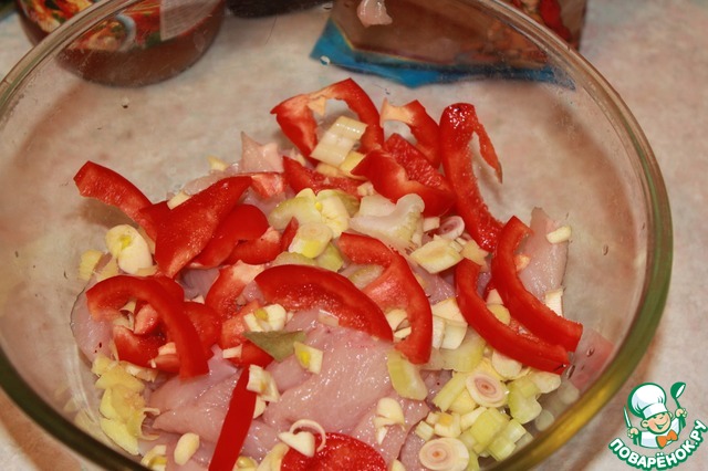 Соус добавляем к курице перемешиваем. Если есть время, даем промариноваться минут 30, а если времени мало можно сразу приступать к обжарке.
