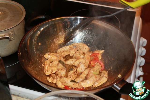 Берем сковороду Вог наливаем кунжутное масло и сильно раскаляем. Затем небольшими порциями выкладываем курицу и обжариваем минут 5-7.