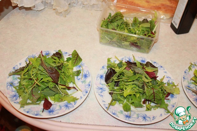 . Пока курица обжаривается на тарелку выкладываем микс салата, когда курица готова выкладываем на салат.