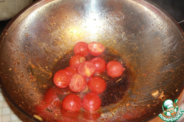 На этом же масле обжариваем порезанные пополам Помидорчики черри и выкладываем к курице.