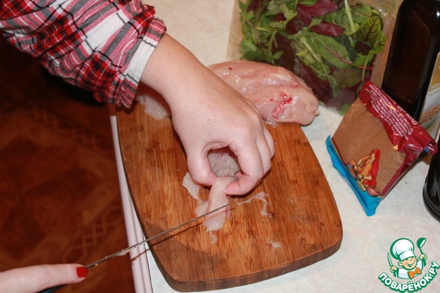 Куриную грудку нарезать брусочками.
