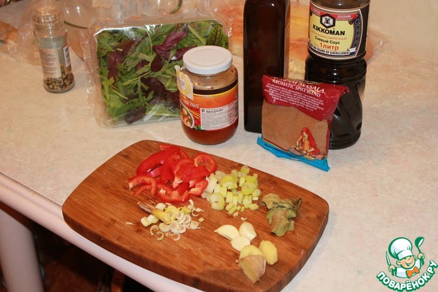 Затем порезать болгарский перец, сельдерей, корень имбиря, чеснок, стебель лемонграсса. Смешать с курицей.