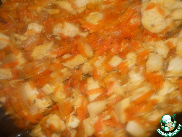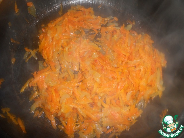 Морковь натереть на крупной тёрке, лук порезать четвертинками колец. Обжариваем овощи до золотистого цвета.
