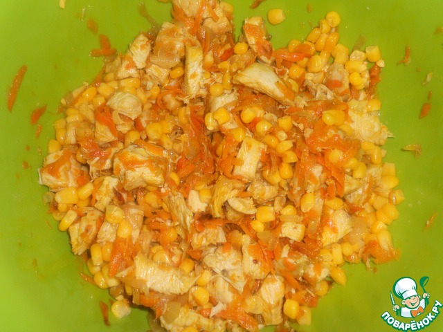 Снимаем с огня. Когда салат немного остынет, добавляем кукурузу. Солим, перчим, выдавливаем чеснок и заправляем майонезом. :)