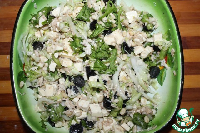 Сделал фету (http://www.povareno k.ru/recipes/show/96 725/ тут рецепт), подумалось, что надо сделать с ней салат. Греческий салат - не мой вариант, так как не люблю сладкий перец, оливки, оливковое масло. Потому придумал свой рецепт.