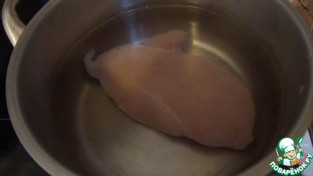 1. Варим куриное филе (за 15 минут до готовности необходимо посолить и поперчить по вкусу). Варим яйцо и морковь.
