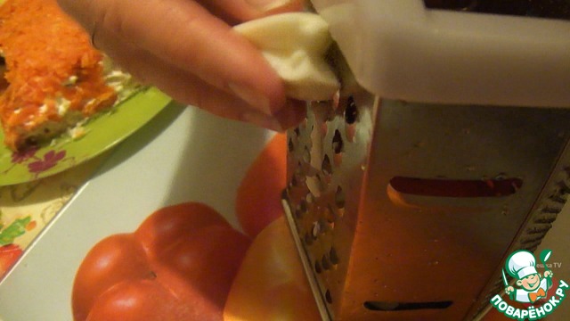 5. Разделываем свареное филе на волокна и смешиваем с половиной майонеза. Натираем морковь и белок яйца на терке.