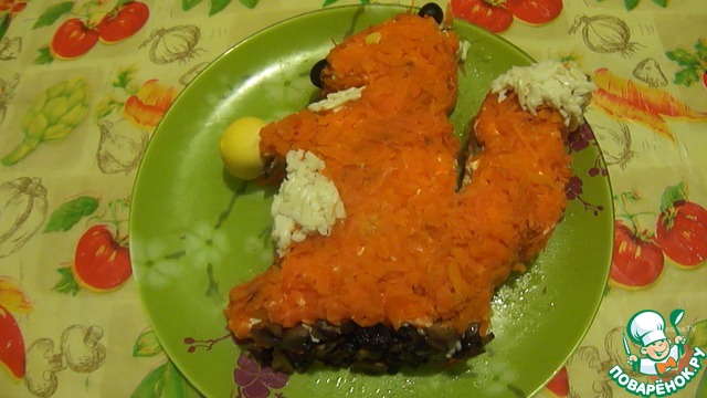 | Довольно оригинальный салат в виде красивой зверушки - белочки. Салат красиво смотрится и к тому же полезный. Легко украсит праздничный стол. Ваши гости останутся довольны как с визуальной, так и вкусовой стороны салата. К тому же готовится довольно легко. |