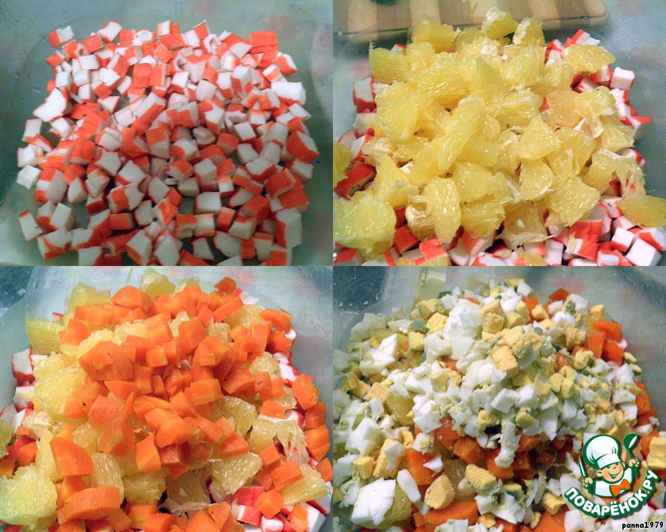 Для начала отварим и почистим яйца и морковь. Этот этап можно сделать заранее. Апельсин очистить от кожуры и пленок (это самый длительный и скучный момент готовки). Все ингредиенты нарезать мелкими кубиками. Более изысканным вариантом нарезки может выступать такой: морковь - ломтиками, яйца д- ольками, крабовые палочки - соломкой. Ну а апельсин в обоих случаях - каждую очищенную дольку разделить на несколько частей вдоль волокон.