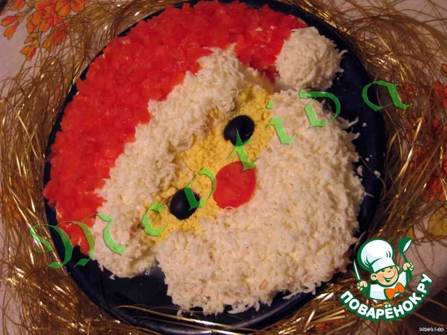 Выкладываем салат на большую тарелку в виде головы Деда Мороза (Санта Клауса или просто забавного гномика, кому как больше нравится:) )