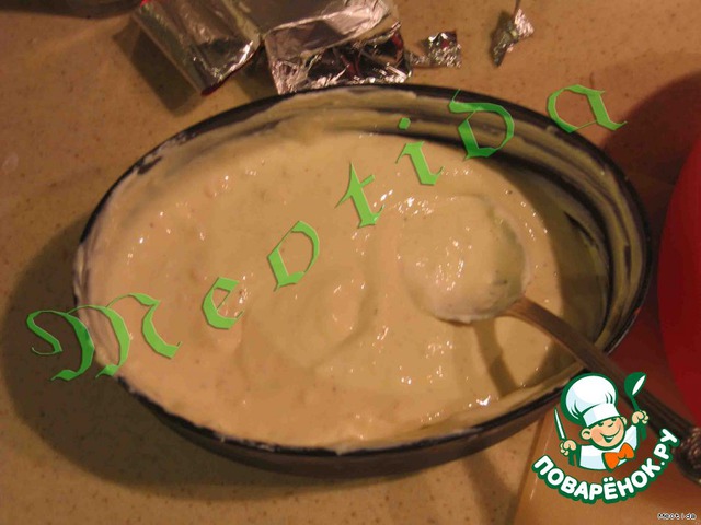 Смешиваем сыр, 2 желтка, измельченный чеснок и 2 ст.л. сметаны с помощью блендера в однородную кремообразную массу. Добавляем соль и перец по вкусу, покрываем этой смесью равномерненько салатик.