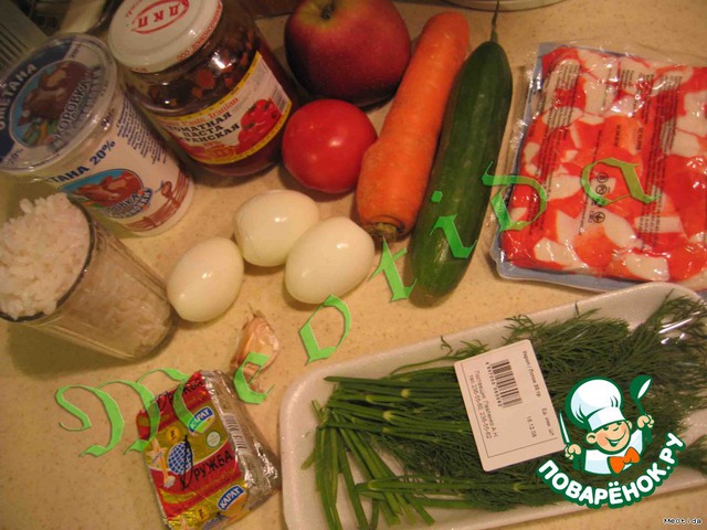 Смешиваем крабовое мяско, огурчик, помидорчик, морковочку, яблочко, укропчик, заправляем 3 ст.л. сметанки и 2 ч.л. горчицы, можно приправить солью и перчиком по вкусу, хорошенько перемешиваем.