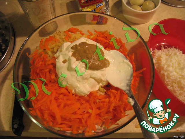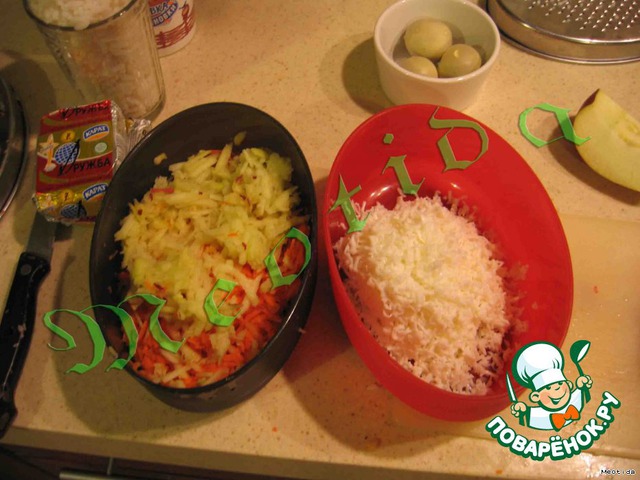 На крупной терке надо натереть яблочко и морковочку, на мелкой - белки.