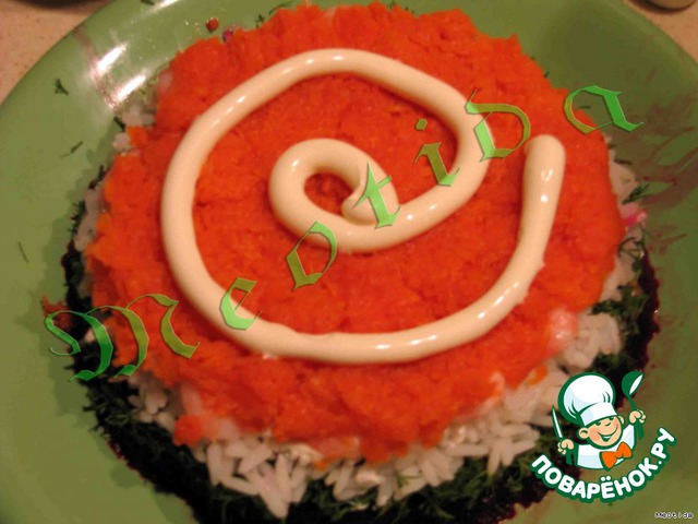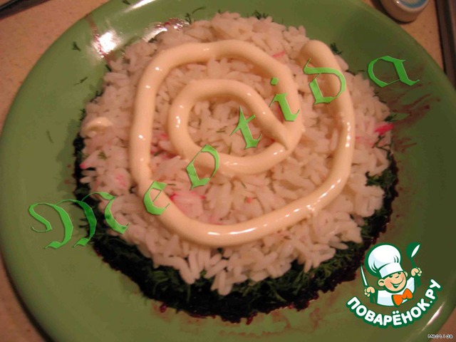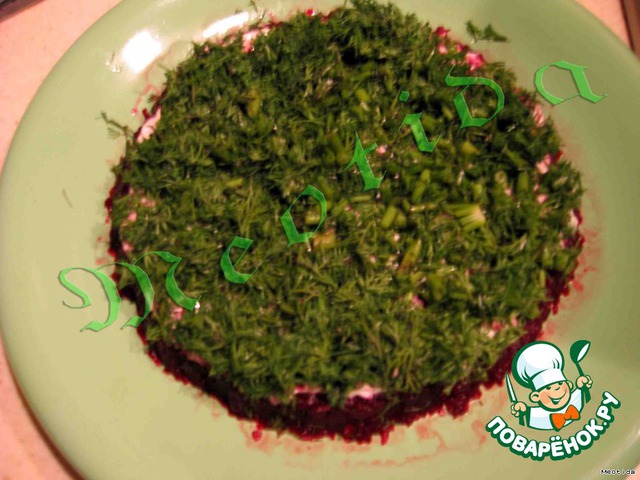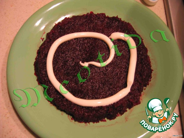 выкладываем на тарелку слой свеколки, слегка смазываем майонезом