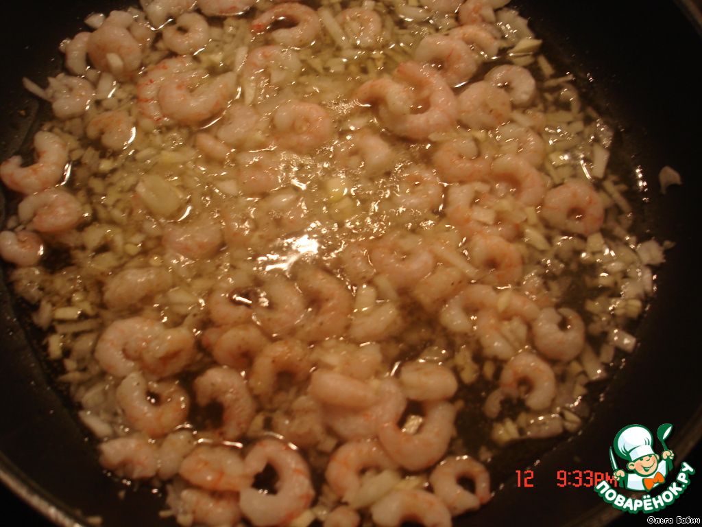 Прожарить с луком креветки пару минут, добавить чеснок мелко порезанный, специи.
