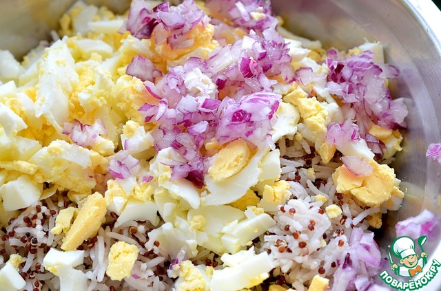 К сваренному рису с киноа добавить нарезанные кубиками варёные яйца и мелко нарезанный красный лук.