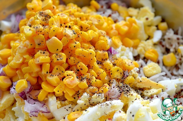 Всыпать консервированную кукурузу (без жидкости). Поперчить по вкусу.