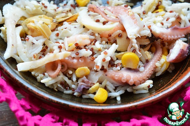 | Я дважды готовила этот салат, и получилось так, что для разных компаний. Всех, без исключения, ввёл в заблуждение один ингредиент. Почему-то именно он вызвал бурные споры по поводу своего происхождения. Благодаря отсутствию в салате майонеза (все ингредиенты отчётливо видны) и именно присутствию морепродуктов разных видов создаётся впечатление присутствия в салате икры. Во всяком случае, именно такая версия была оглашена с утверждением в качестве доказательства : - "ОНО" же лопается! "Оно" - это киноа. Если хотите повеселиться и удивить, то смело готовьте этот салат. По вкусу он очень напоминает знаменитый рисовый салат с крабовыми палочками. Но после этого рецепта вы поймёте, что прежде вы готовили эрзац. |