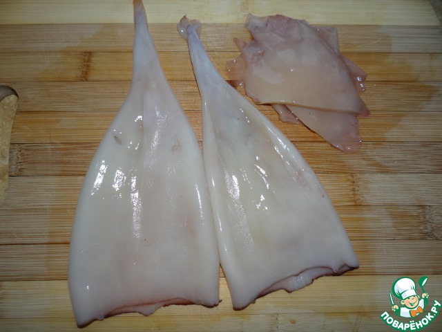 Кальмары очистить от пленки и внутренностей, отрезать плавнички;