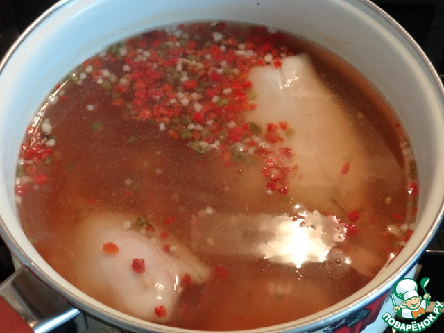 Выложить в воду кальмаров, довести до кипения, выключить огонь и выдержать кальмаров в воде 10 минут (приготовленные таким образом кальмары - нежные, мягкие и ароматные);