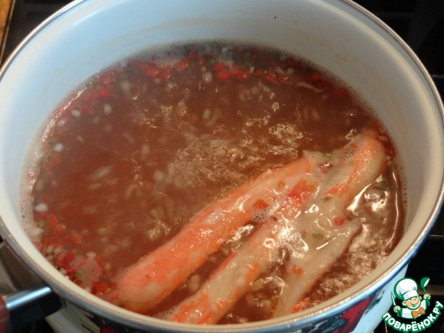 Вынуть кальмары из воды, воду снова довести до кипения и выложить в воду крабовое мясо;
