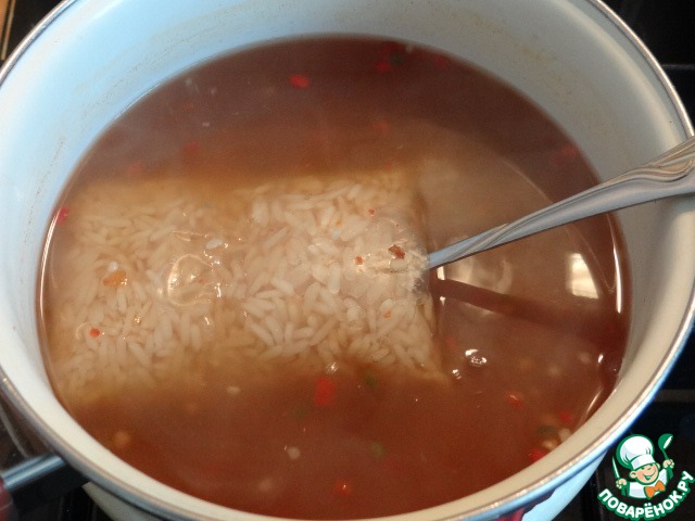 Третий раз довести воду до кипения, заложить в воду пакет с рисом и готовить столько, сколько предполагает инструкция на упаковке (рис получается с очень насыщенным морепродуктовым вкусом!);