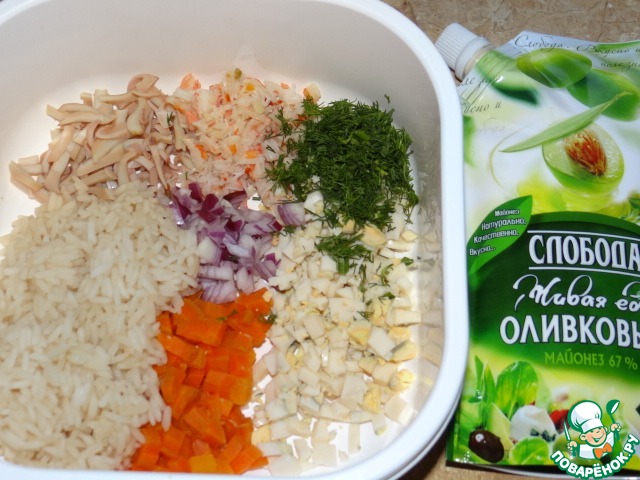 Добавить остывший готовый рис, заправить майонезом - перемешать;