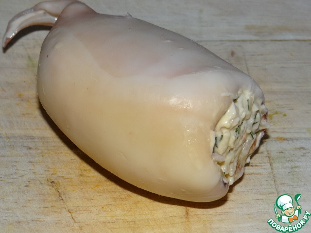 Начинить кальмаров салатом плотно, убрать в холодильник до полного остывания на 1 час;