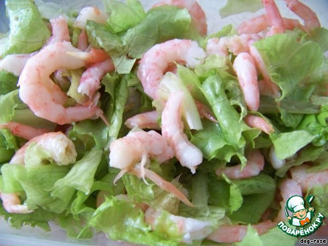 Креветки (если неочищенные, то заливаем кипятком на пару минут, сливаем воду и чистим) смешиваем с оставшимся салатом, который аккуратно рвем руками.