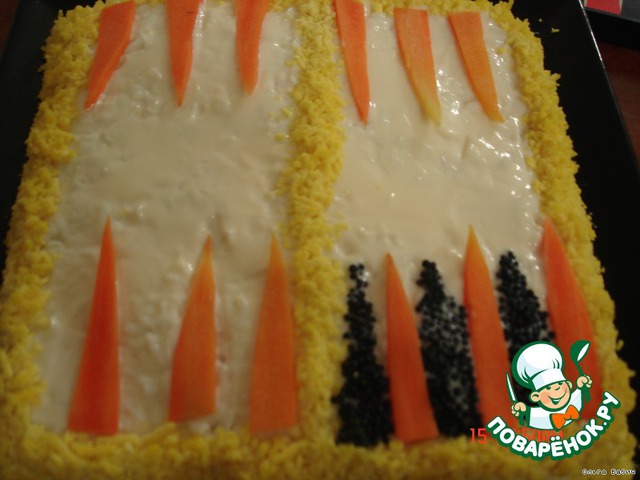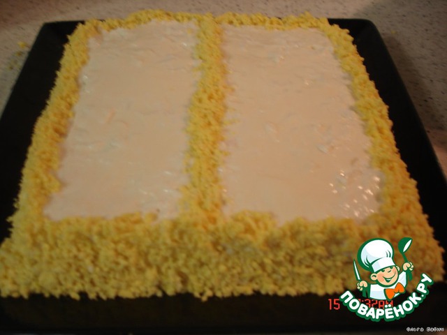 Промазать слоя майонезом,вех покрыть майонезом обильно,начинаем украшать желтком