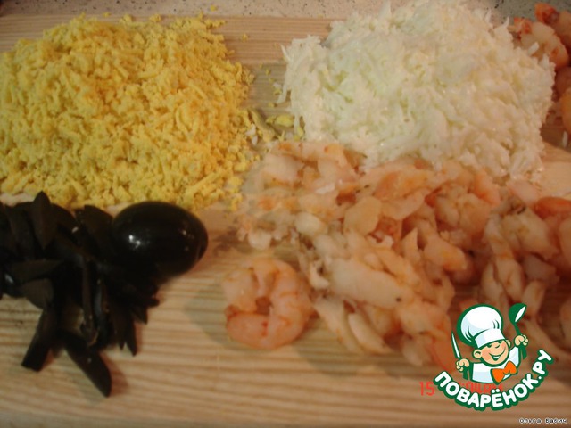 потрем белок яиц отдельно,желток отдельно,порежем маслинки соломкой,креветки кусочками,лук мелко.