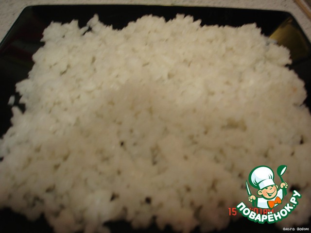 Рис отварить, дать остыть и уложить на блюдо.