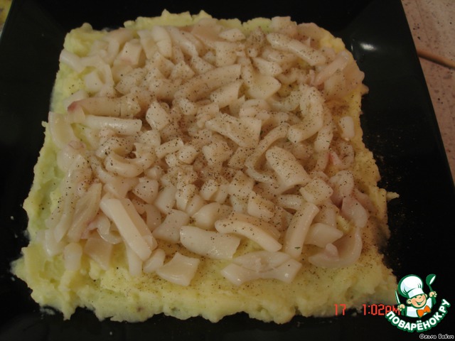 Кальмары порезать, положить сверху, поперчить, присолить, на них положить порезанный лук, который я замариновала и забыла про него.