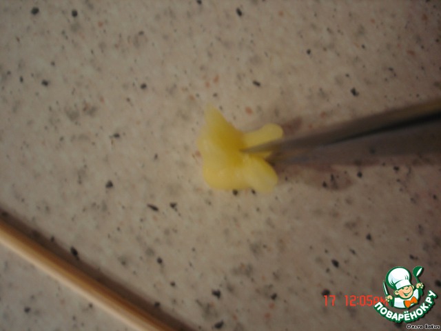 Вареный картофель помять как пюре с 1 ст.л. оливкового масла, уложить на блюдо, присыпать душистым перцем