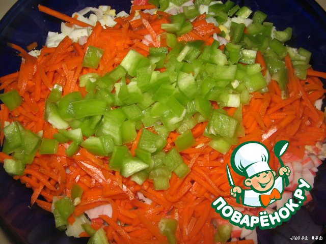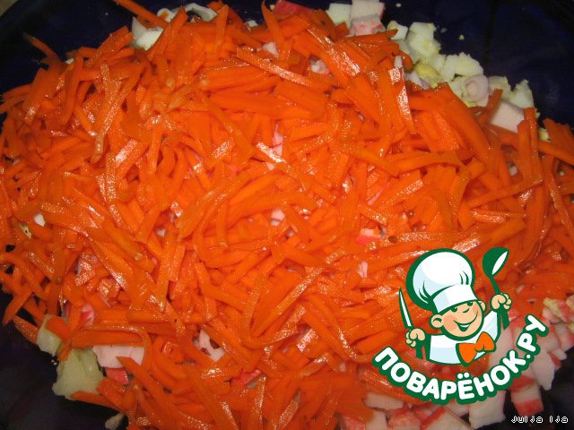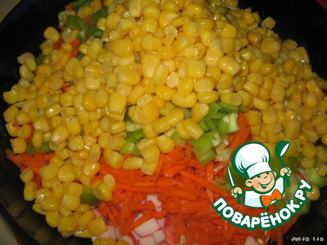 | Салат с крабовыми палочками, корейской морковкой, кукурузой и цветной капустой. Придумывала сама, по ходу действия, основой были морковь и палочки, остальное прибавилось и весьма удачно. Долго не могла придумать название, остановилась на этом, только из-за цвета салата. |
