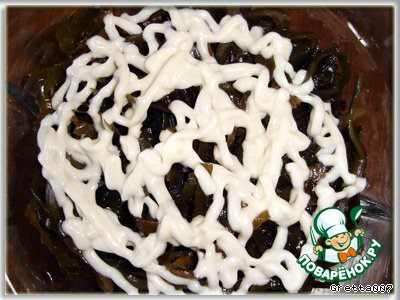 Украсить горку салата майонезом, кресс-салатом и морской капустой.