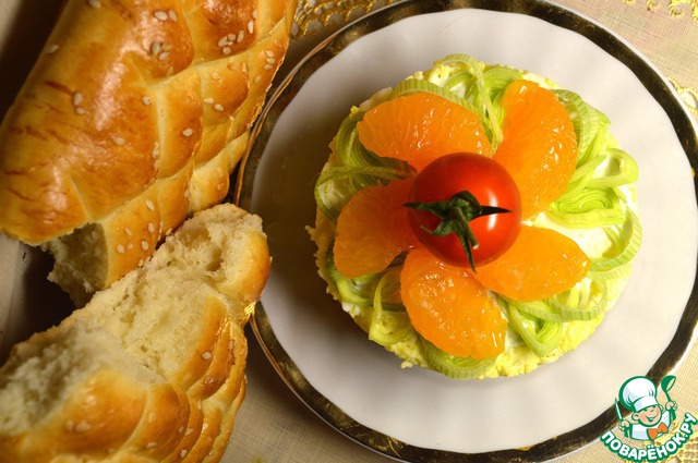 | Вариант слоеного салата, который готовится за 10 минут. Красиво смотрится на столе, вкус сочного мандарина отлично сочетается со всеми ингредиентами, а огуречно-сметанная заправка делает его легким. |