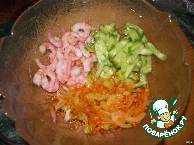 Морковь и лук режем соломкой, обжариваем на растительном масле. главное не пережарить, а то вкус лука забьет вкус всего остального.Креветки отвариваем и чистим. Огурчик и грушу тоже режем соломкой.