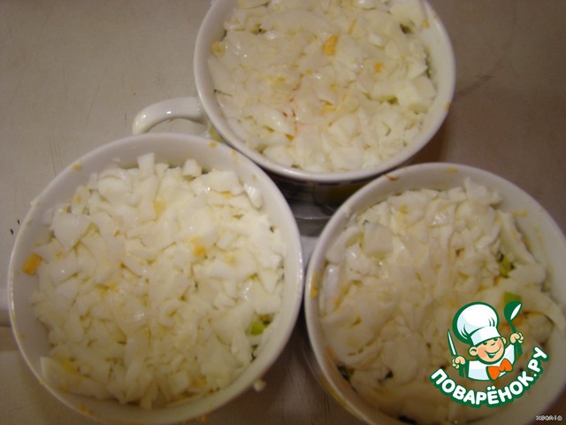 Мясо криля укладываем на дно порционных чашек...немного приминая..