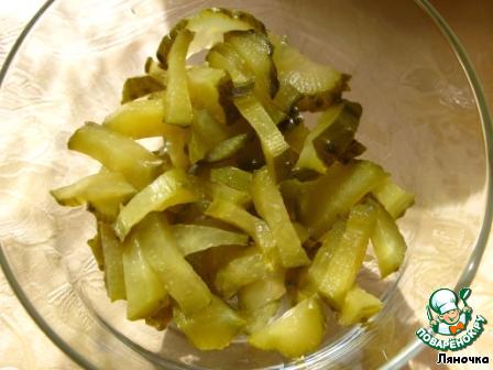 На дно креманок положить слой маринованных огурчиков, порезанных соломкой. Огурчики должны быть вкусными, не кислыми.