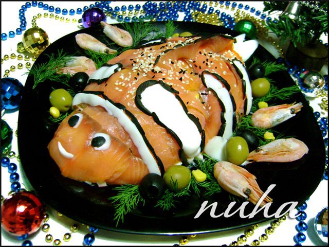 Из оставленного яичного белка вырезать полосы, выложить на нашу рыбку. Также сделать из белка глаза, хвост и плавники. Маслины нарезать тонкими полосками, сделать окантовку на хохолок и на белые полоски на теле рыбки, зрачки. Посыпать чёрным и белым кунжутом. Украсить блюдо креветками, зеленью укропа, кукурузой, маслинами и оливками. Подать к праздничному новогоднему столу!