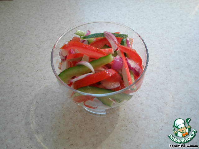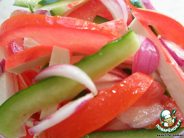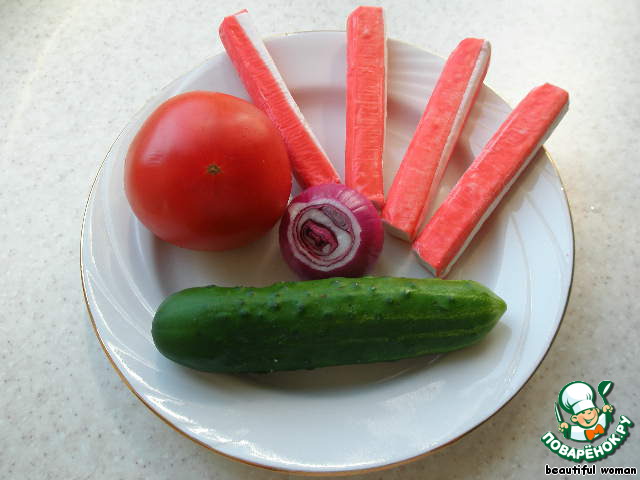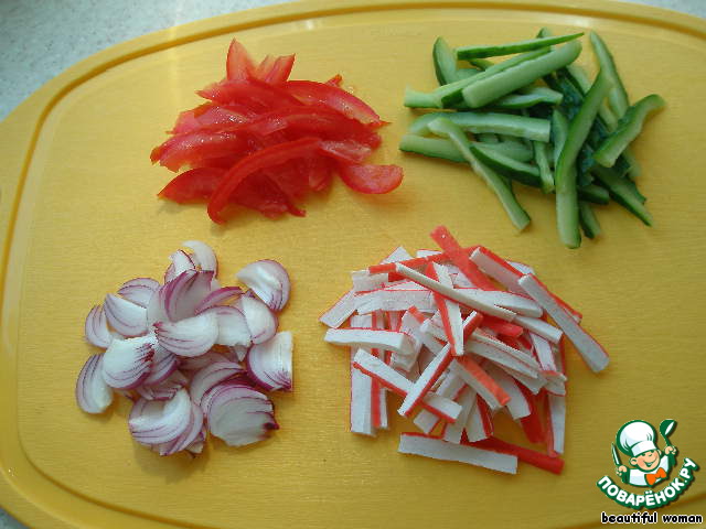 Нарезаем соломкой крабовые палочки, луковицу, а также огурец и помидор, предварительно освободив их от семян.
